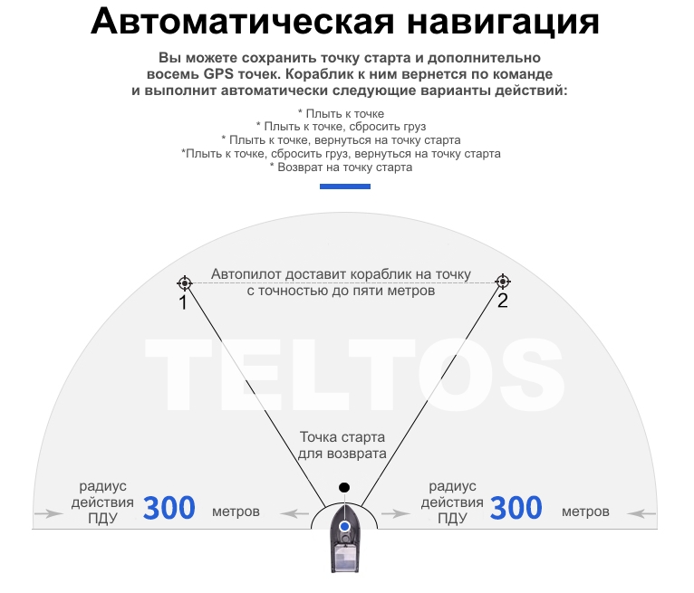 Если кораблик выйдет за пределы действия сигнала ПДУ, или аккумулятор на ПДУ потеряет заряд, то система автопилота автоматически вернет кораблик на точку старта. Поэтому не забывайте перед началом использования сохранять точку старта. При тестировании данной модели кораблика для прикорма, наши инженеры обратили внимание на точность возврата кораблика. Из четырёх циклов возврата, кораблик возвращался к берегу с погрешностью не более одного метра!