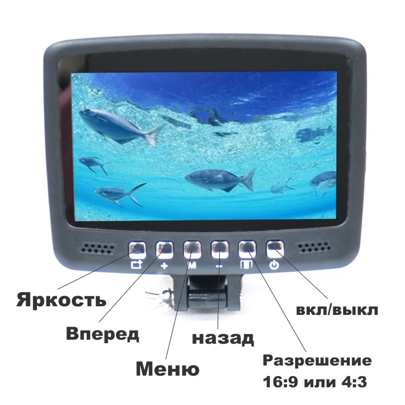 Дисплей монитора видеоудочки имеет диагональ 4.3 дюйма(11см), что гораздо больше, чем у конкурентных комплектов в данном ценовом сегменте. Меню монитора предназначено для настройки всего нескольких параметров, влияющих на качество изображения: контрастность, яркость, насыщенность. В этой модели подводной камеры предусмотрена отдельная кнопка "яркость", она автоматический подбирает яркость, насыщенность, контрастность.