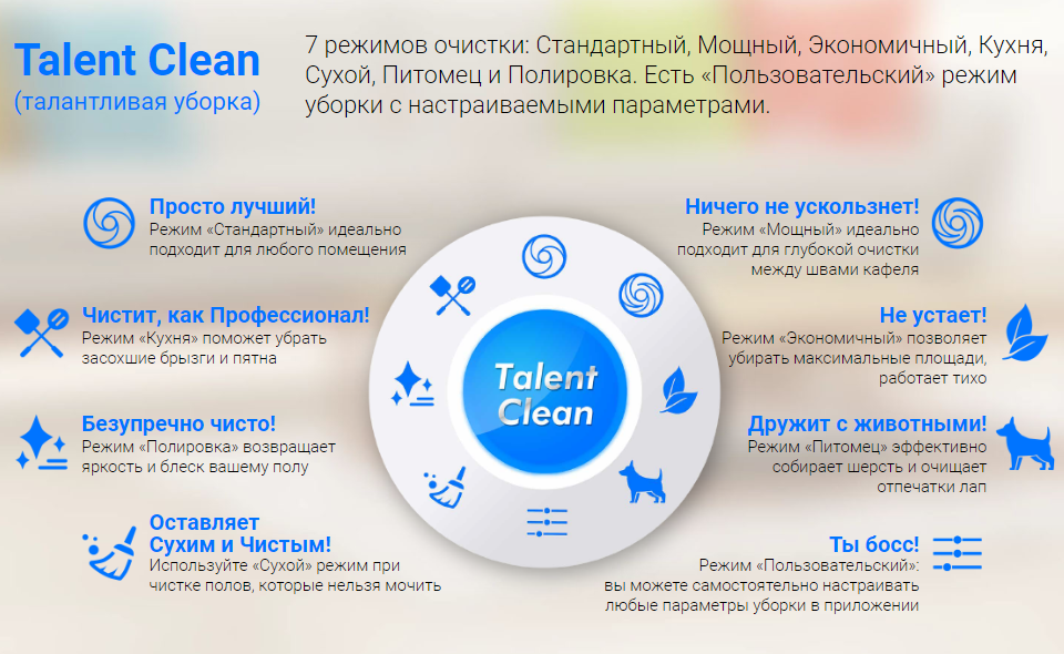 - Режимы умной очистки: Стандарт, Мощный, ЭКО, Кухня, Сухой, Домашние животные и Полировка